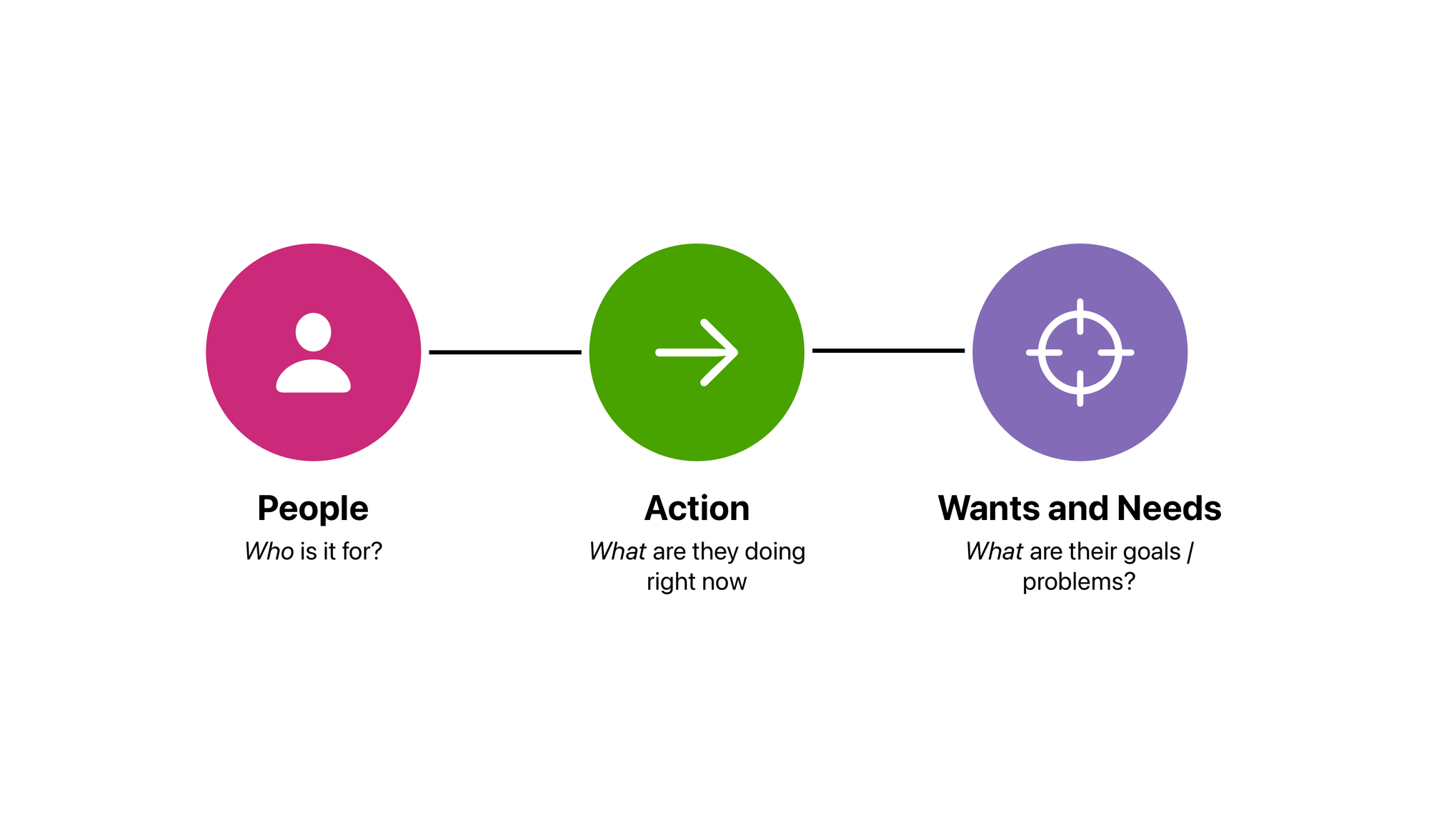 We start with the people, their wants and needs (the problems they are facing) and the actions they perform to achieve them.