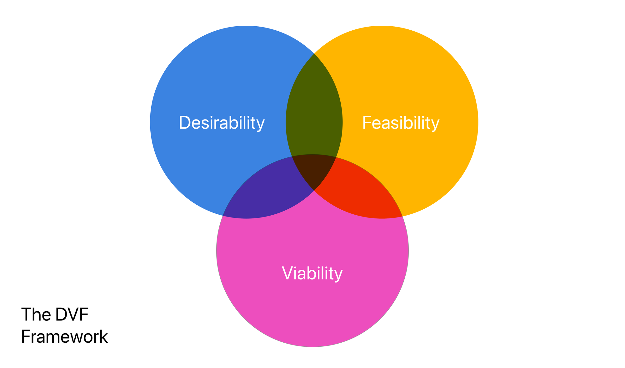 The DVF Framework is one of the many frameworks that can be used to identify the who is going to need this product (desirability), how it's going to be built (feasbility), and the financial viability of the product (viability).