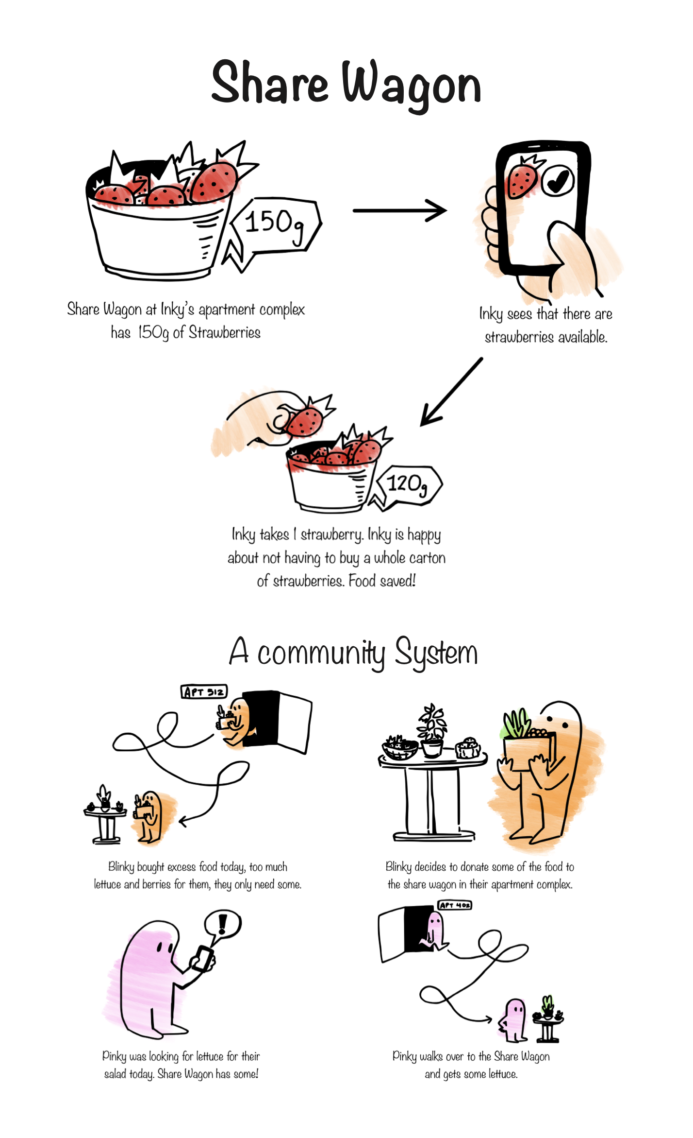 Share Wagon is a community food sharing system, designed to tackle the problem of food waste in apartment complexes. Designed by me and my friend (Aylish Turner), it was based on our collective vision of community building through sharing.