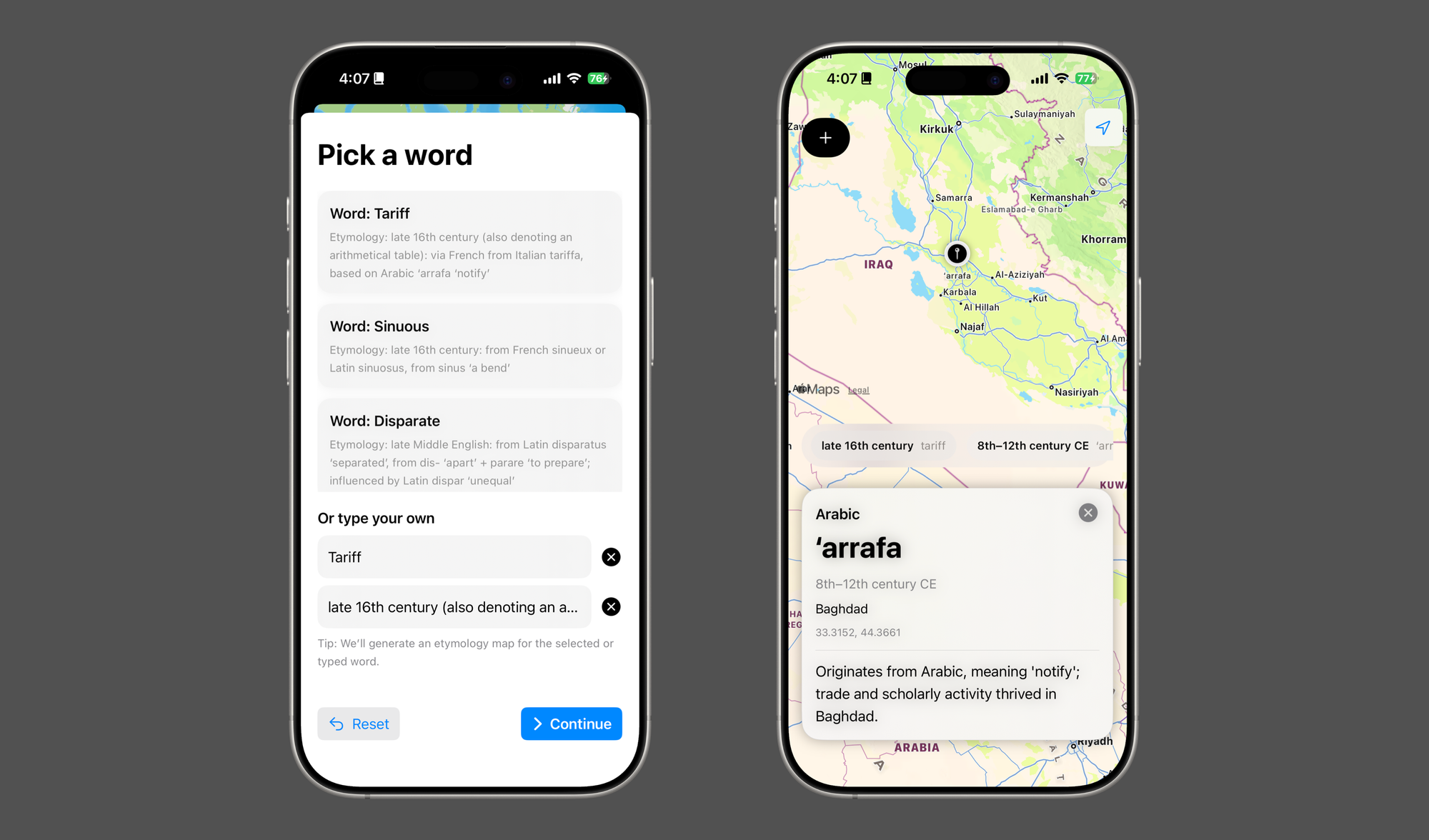 Root ranger was an interesting exploration. It's an app to test the origin maps feature. The feature itself originated from a very rough idea, i.e. what if we could map how a word has travelled across space and time.