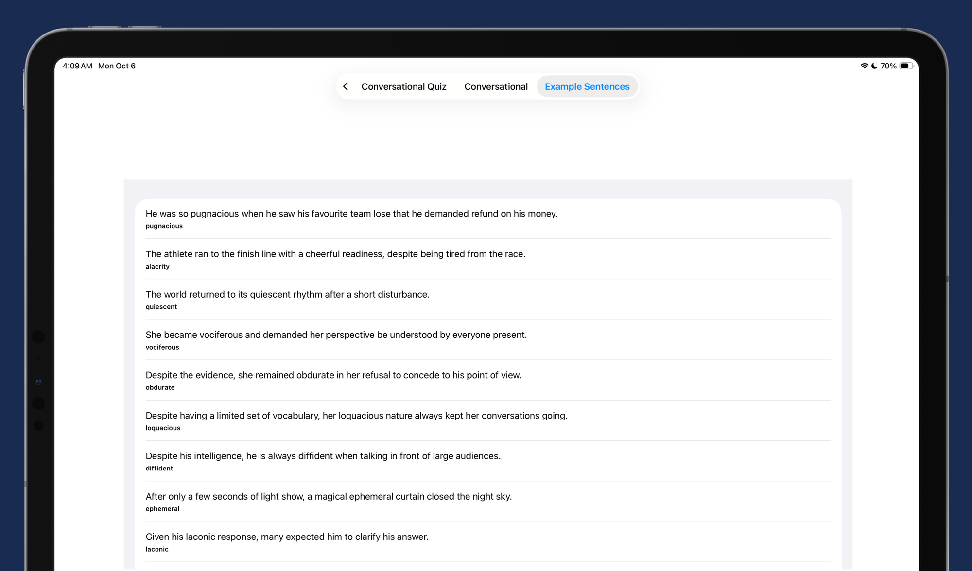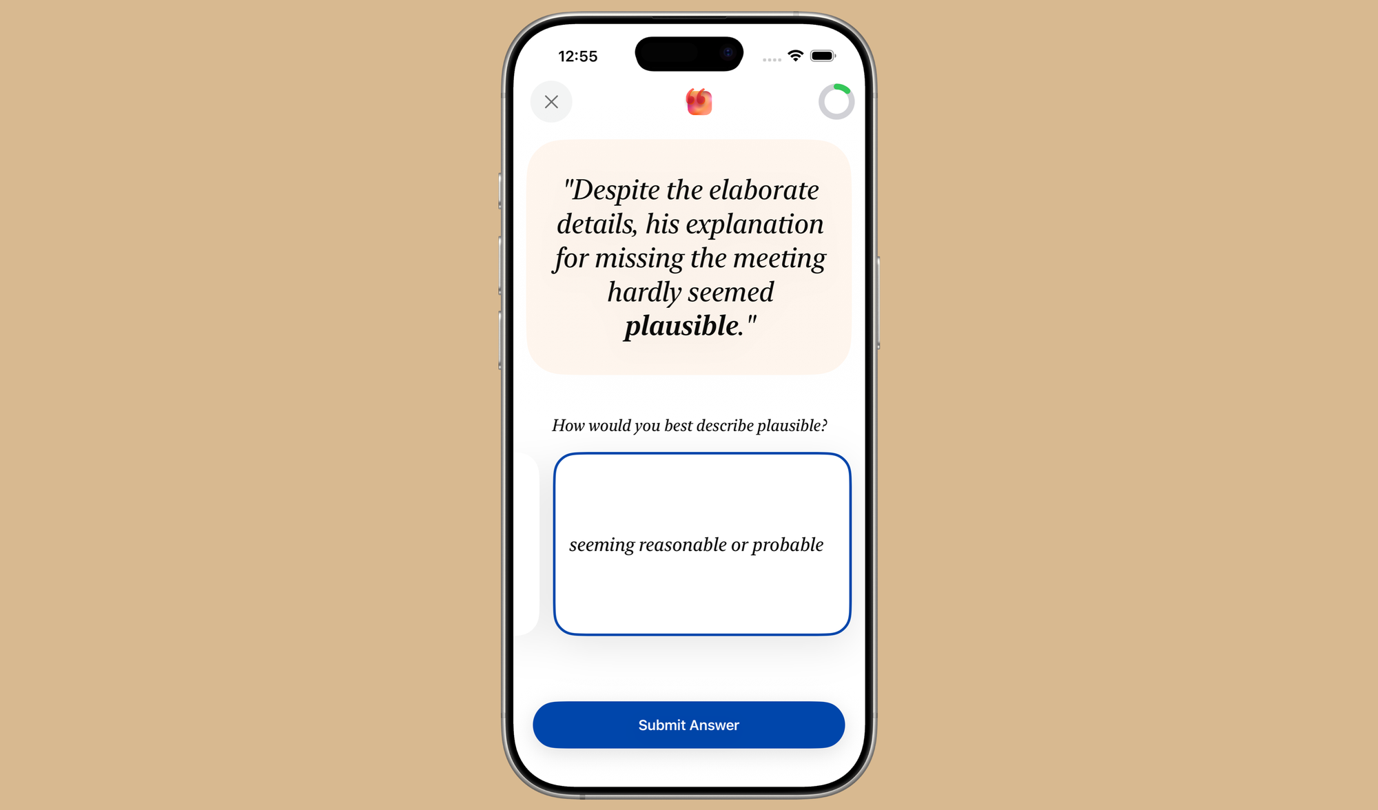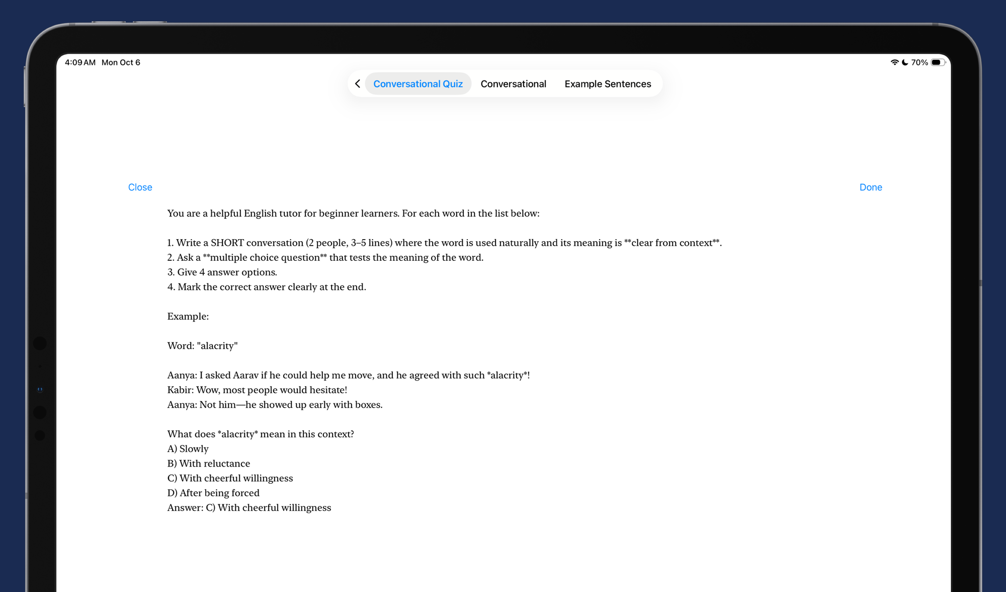 Once the models were tested and designed to work exactly the way I wanted, I was able to put some of the features into the app. Like this Example Sentence quiz feature.